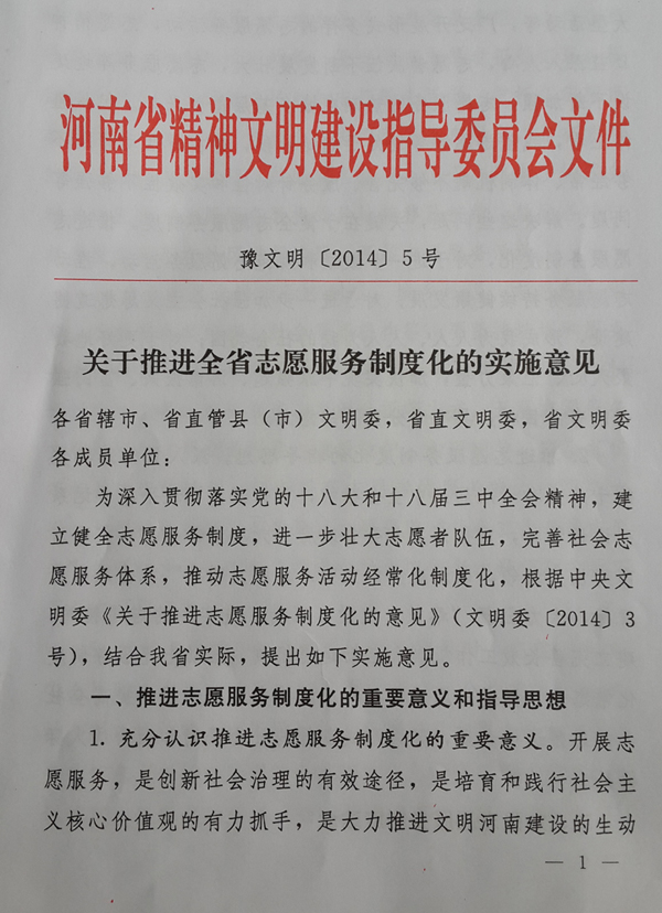 關(guān)于推進(jìn)全省志愿服務(wù)制度化的實(shí)施意見